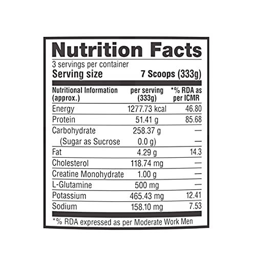 Gives 1278 kcal, 51g Protein, 258g Carbs, 1g Creatine Monohydrate & 500mg L-Glutamine per serving